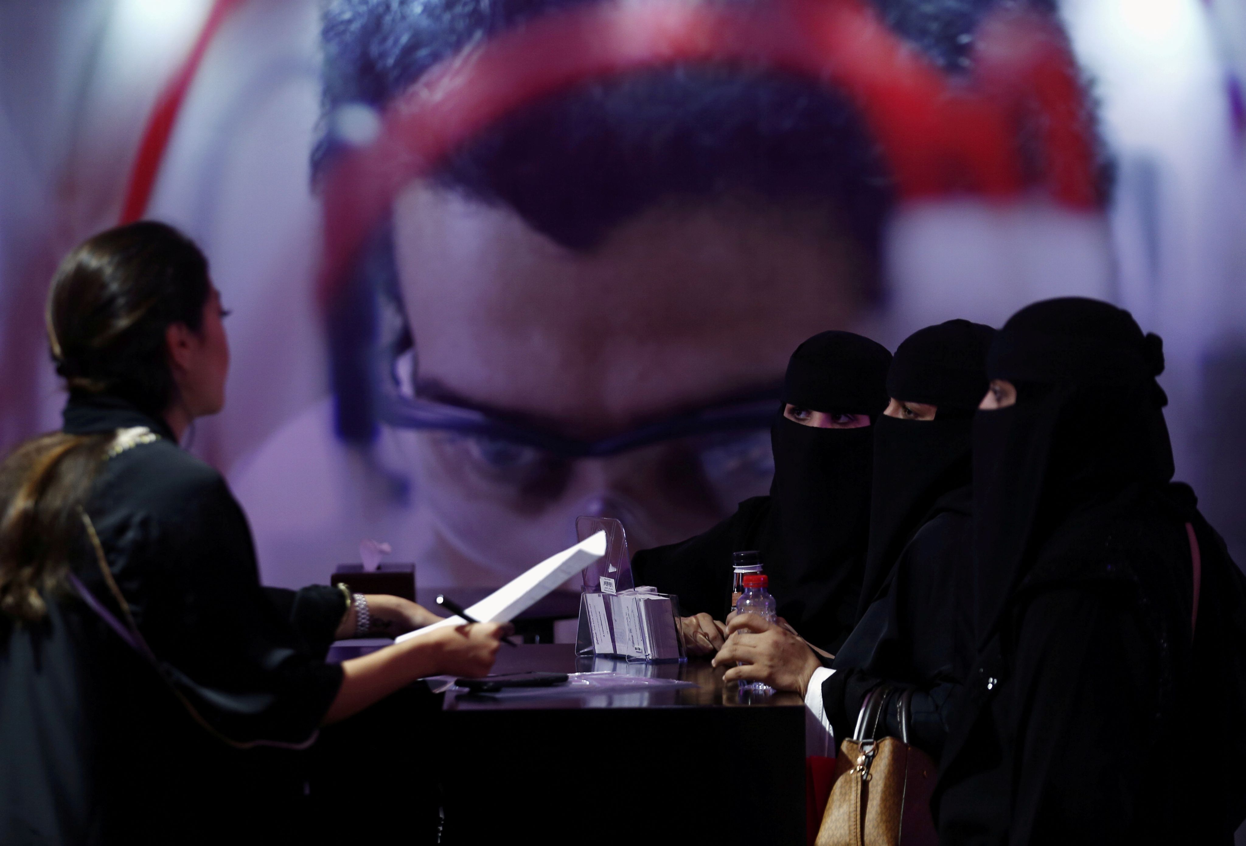 Saudi women with a recruiter at Glowork Women's Career Fair in Riyadh, in October 2018. Reuters