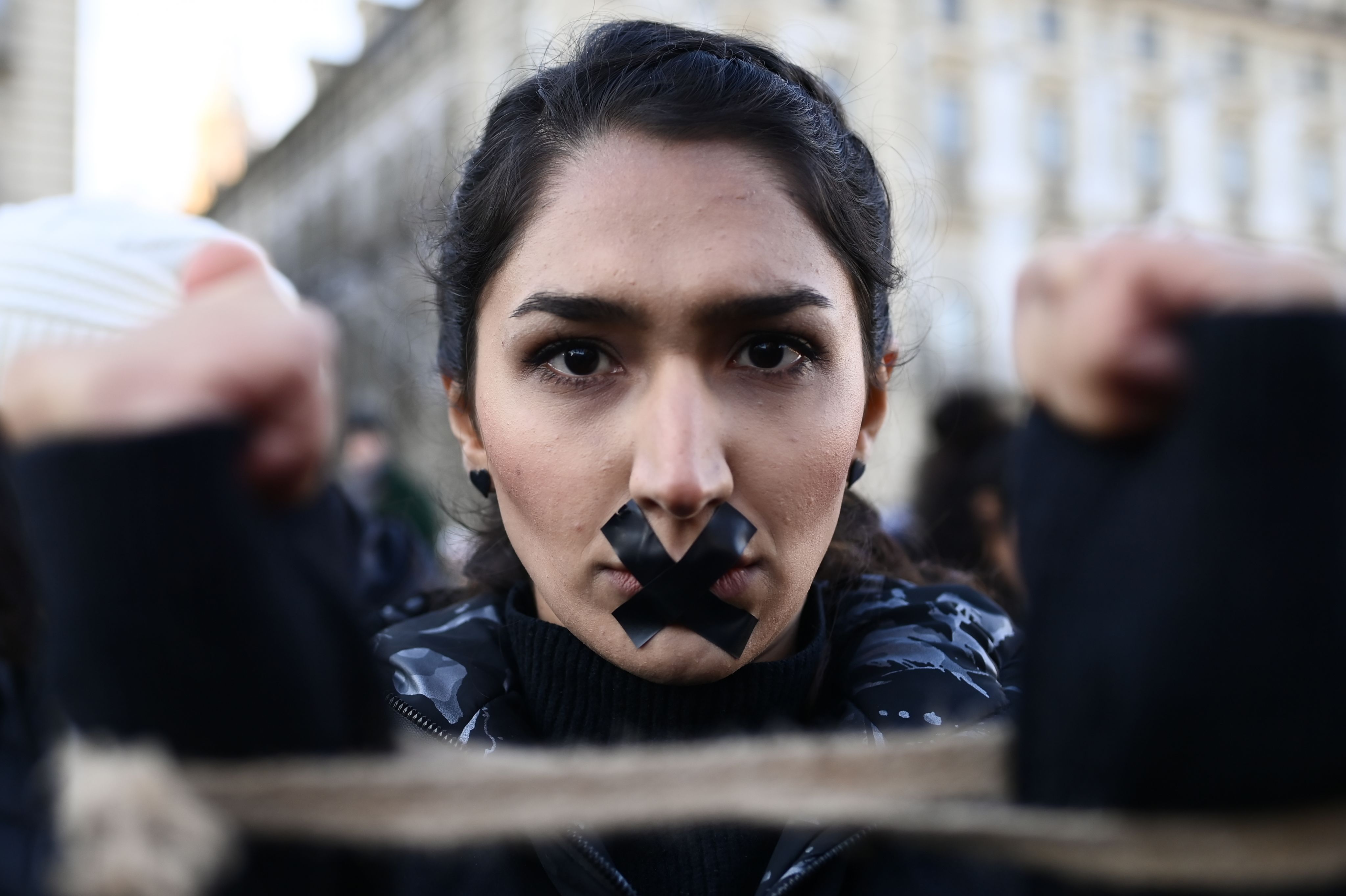 A woman protests in solidarity with Iranian women, in Turin, Italy,on December 17, 2022. Getty
