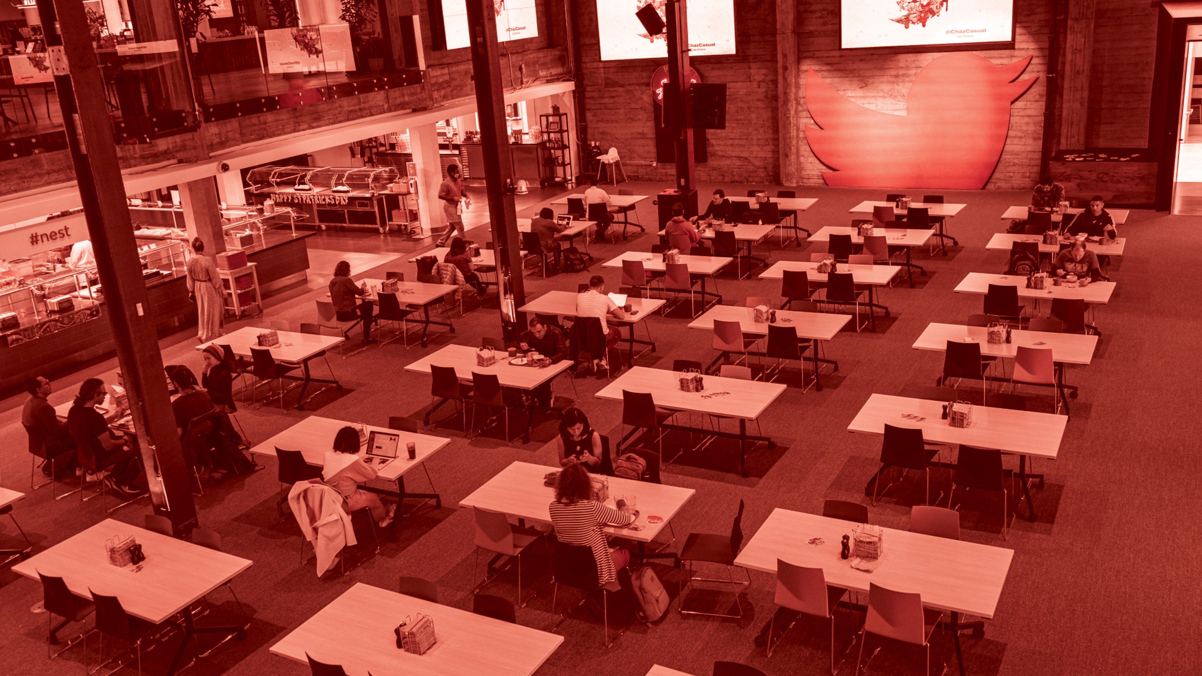 Employees at tables inside Twitter headquarters in San Francisco, on March 17, 2022. Bloomberg
