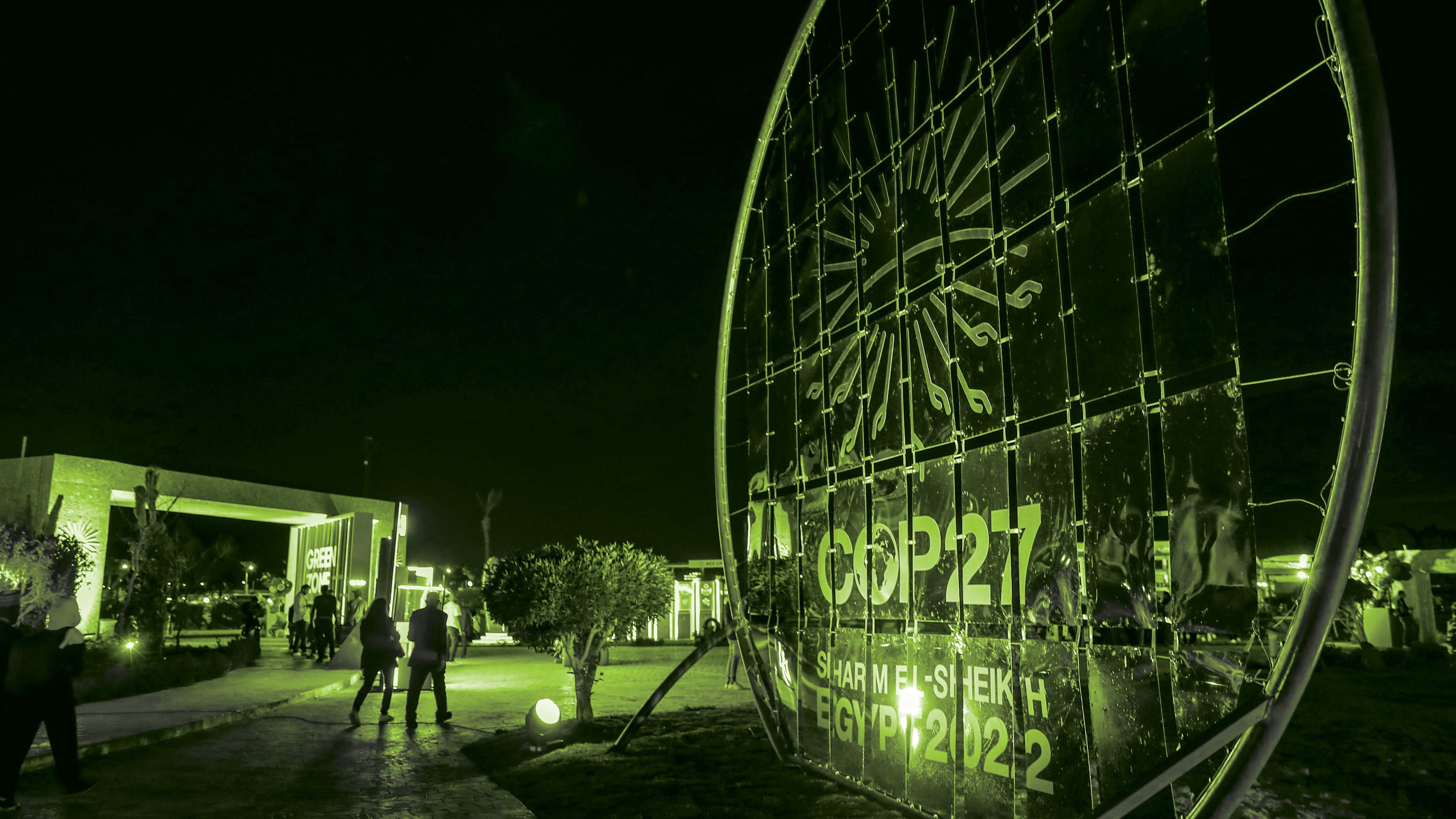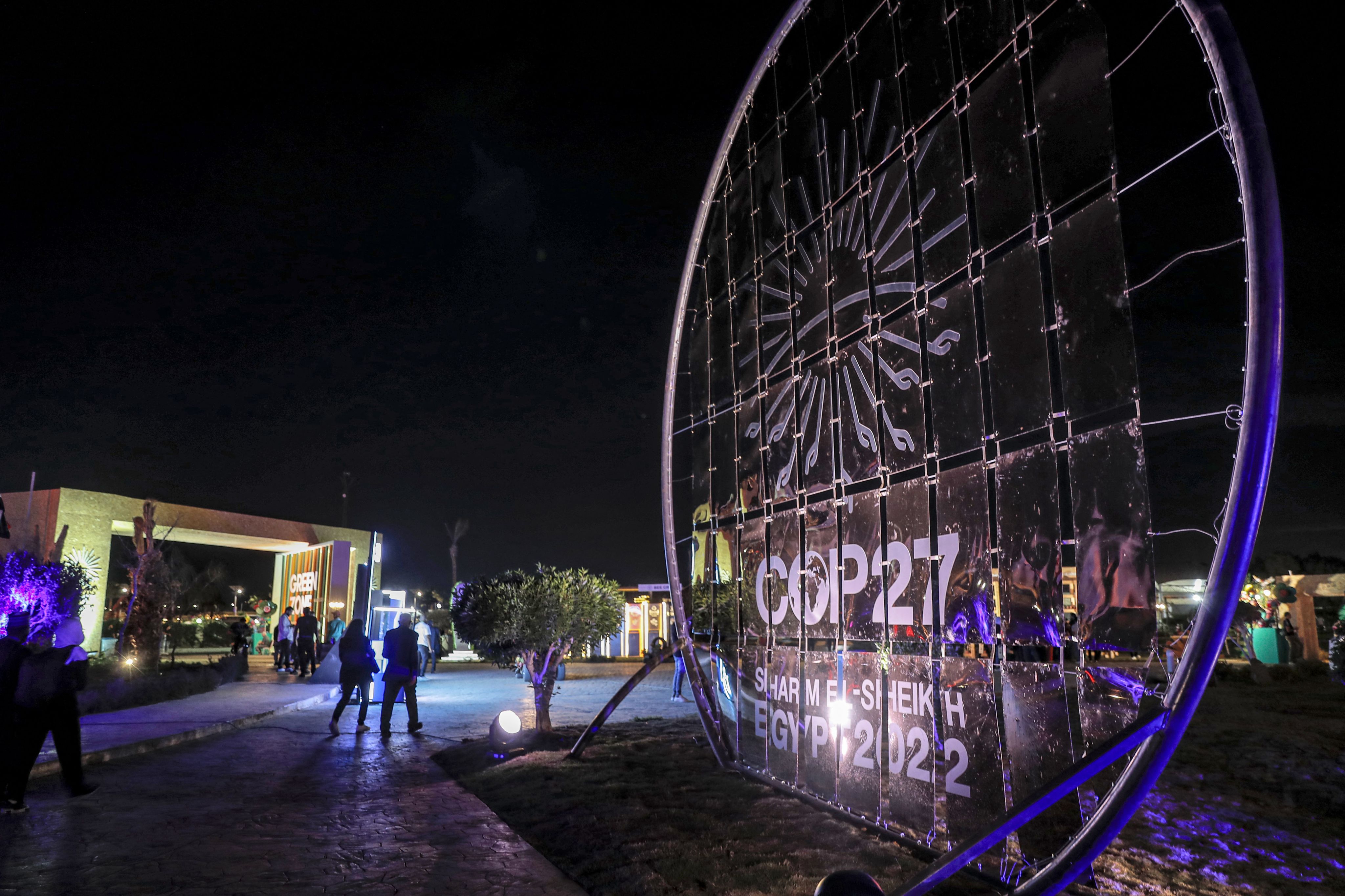 The Cop27 logo on display in the green zone of the Sharm el-Sheikh International Convention Centre on November 14, 2022. AFP