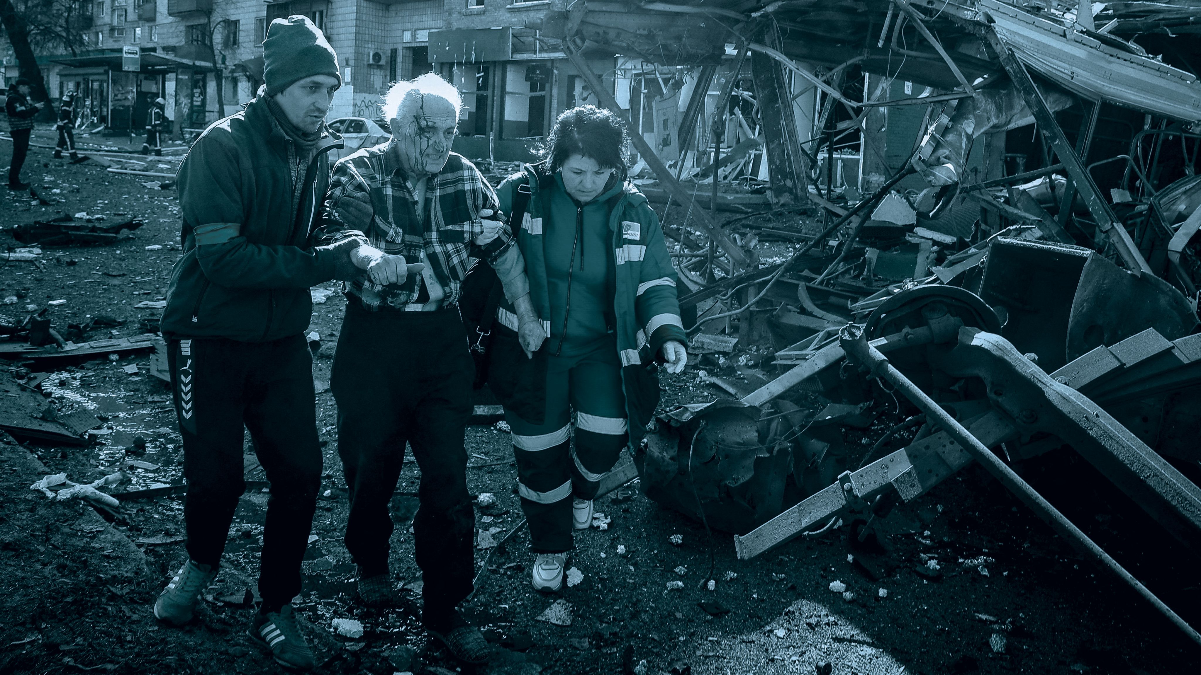 People and medics help a wounded resident of a house destroyed by Russian shelling in Ukraine, on March 14, 2022. Reuters