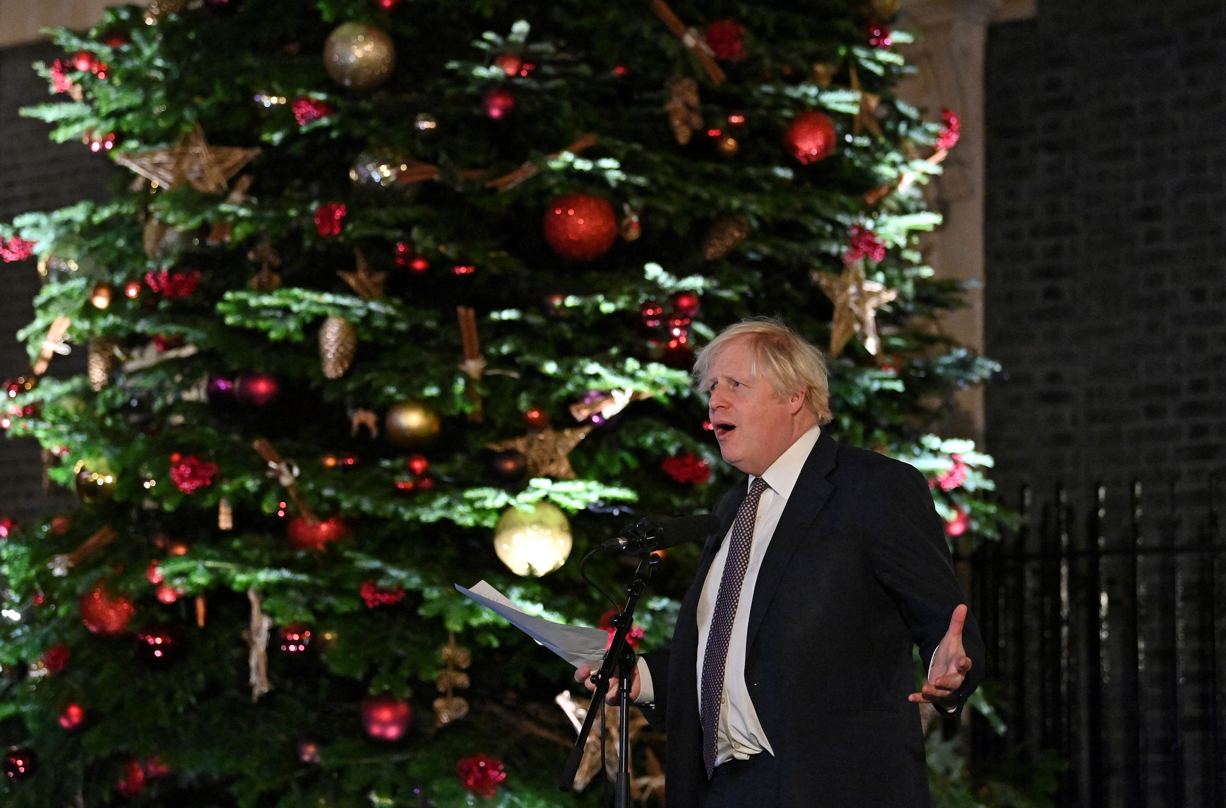 Boris Johnson gives a speech in front of the Downing Street Christmas tree in London, in November 2021. AFP