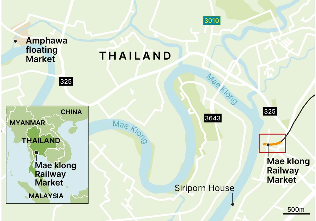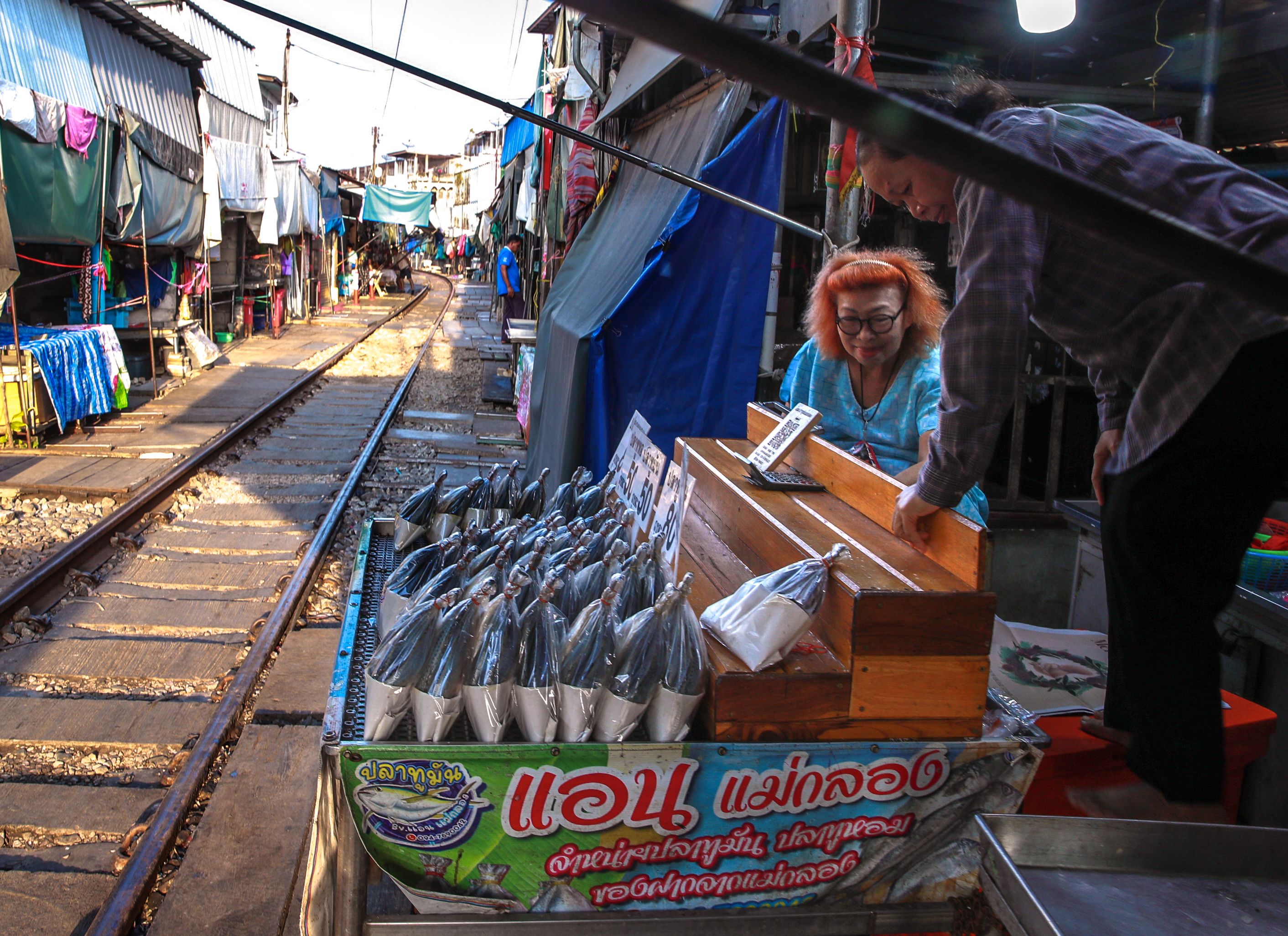 About eight times a day, dozens of market workers hastily pack up their wares and umbrellas and shuffle back a few metres, only to reset their stalls a few minutes later and resume business. They do this to make way for a train that passes through Mae Klong Railway Market.