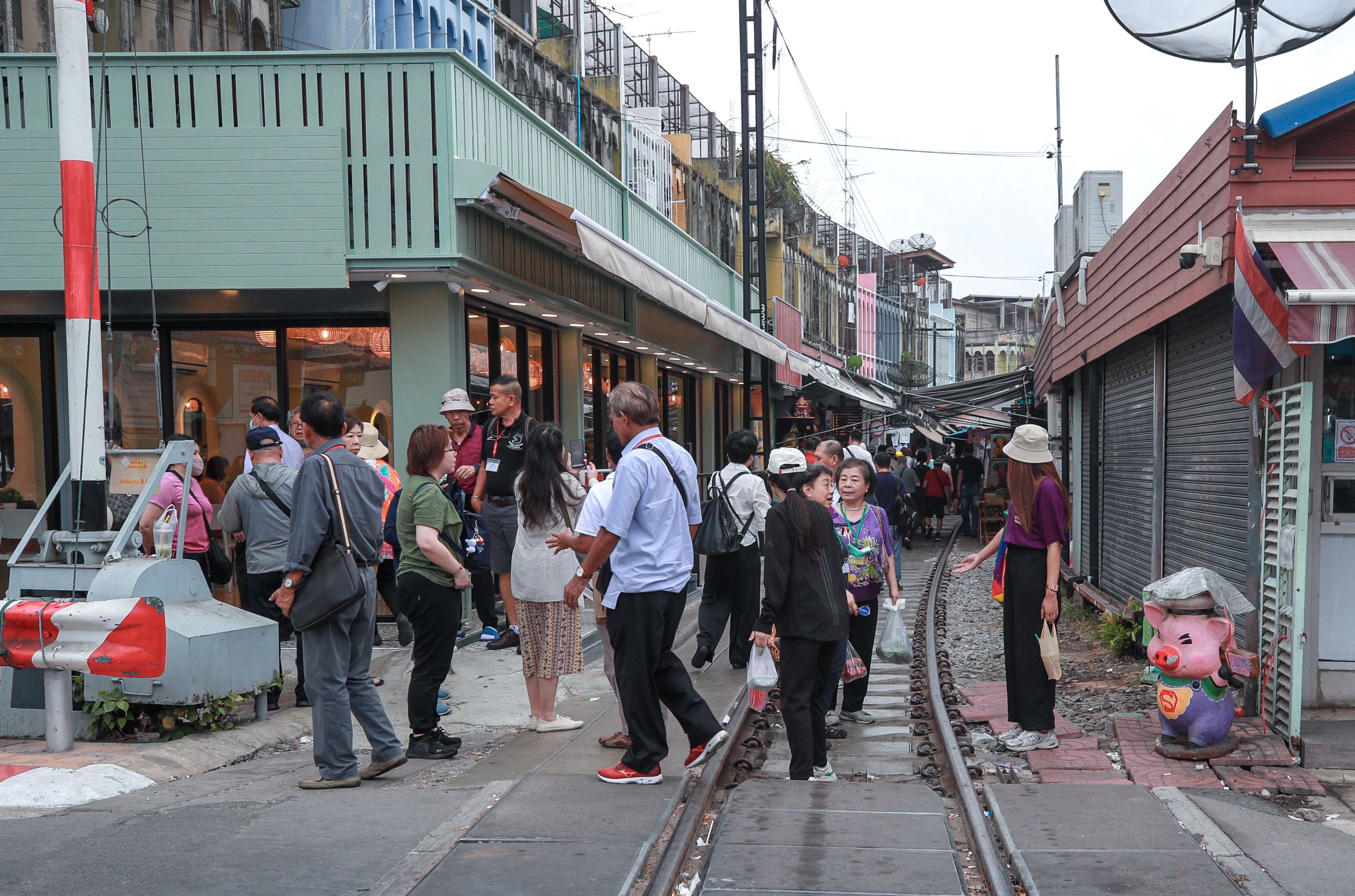 Tourists visiting the market cross the Mae Klong railway track