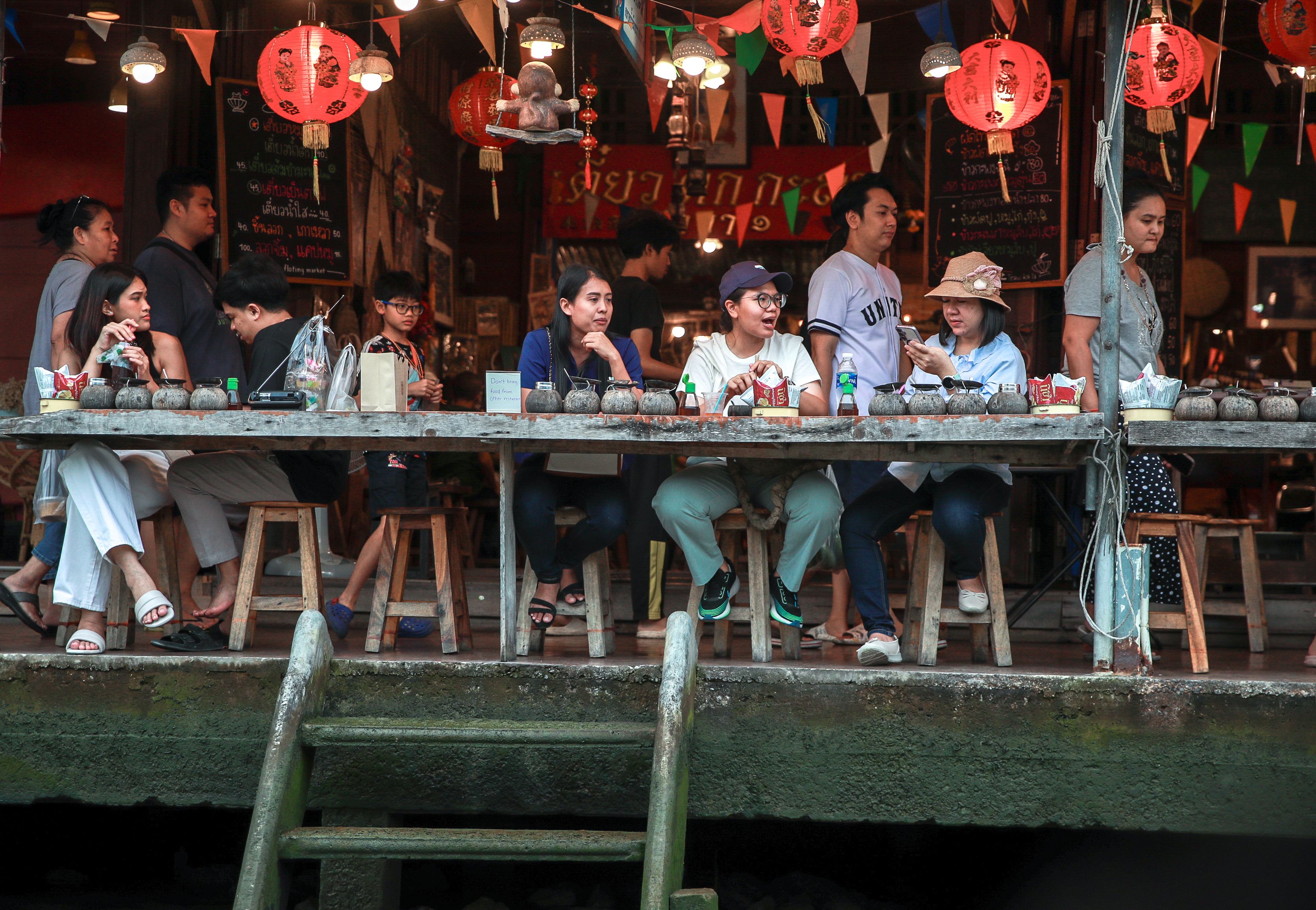 Visitors eat at a restaurant in the Amphawa Floating Market