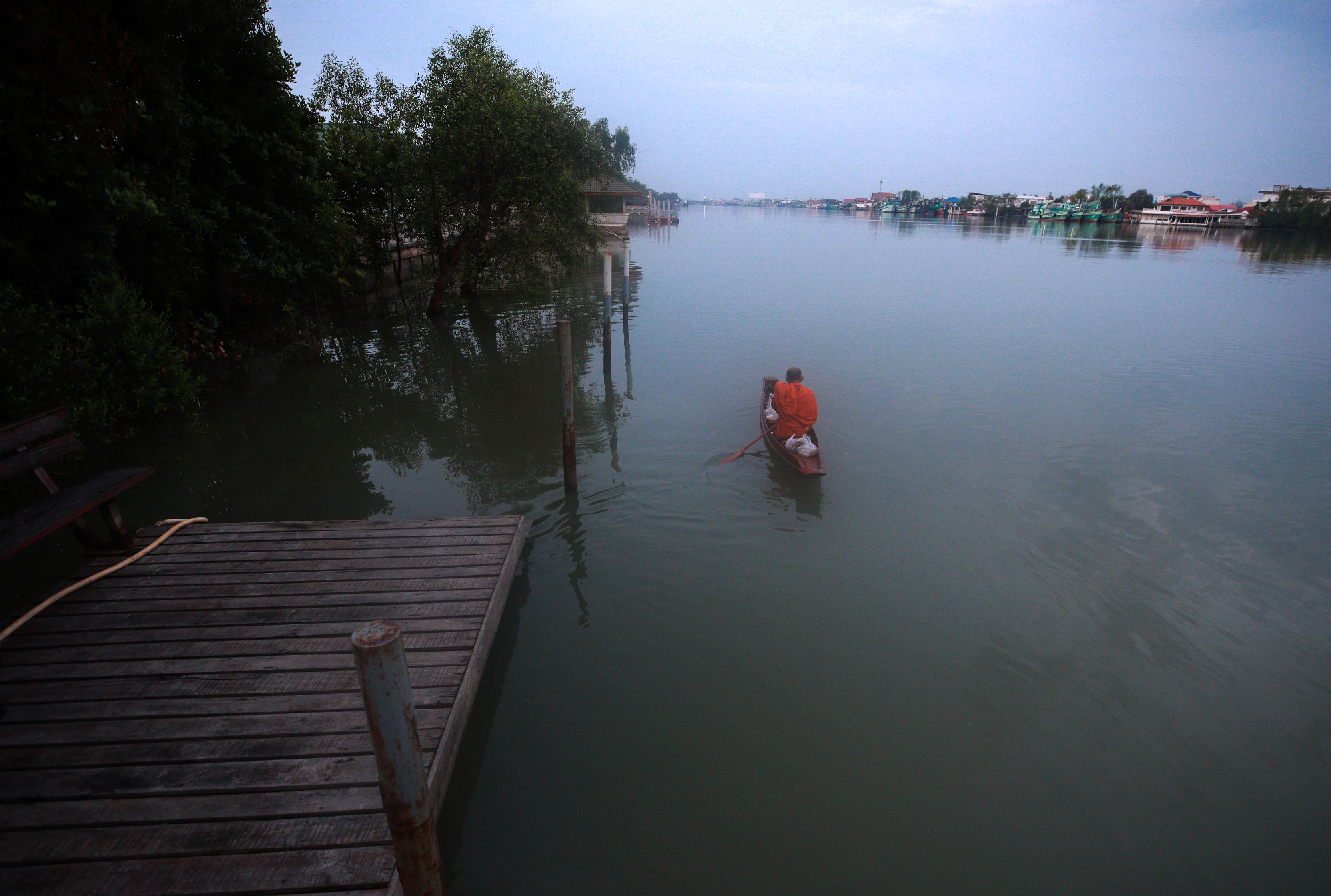 A Buddhist monk travels down the Mae Klong river