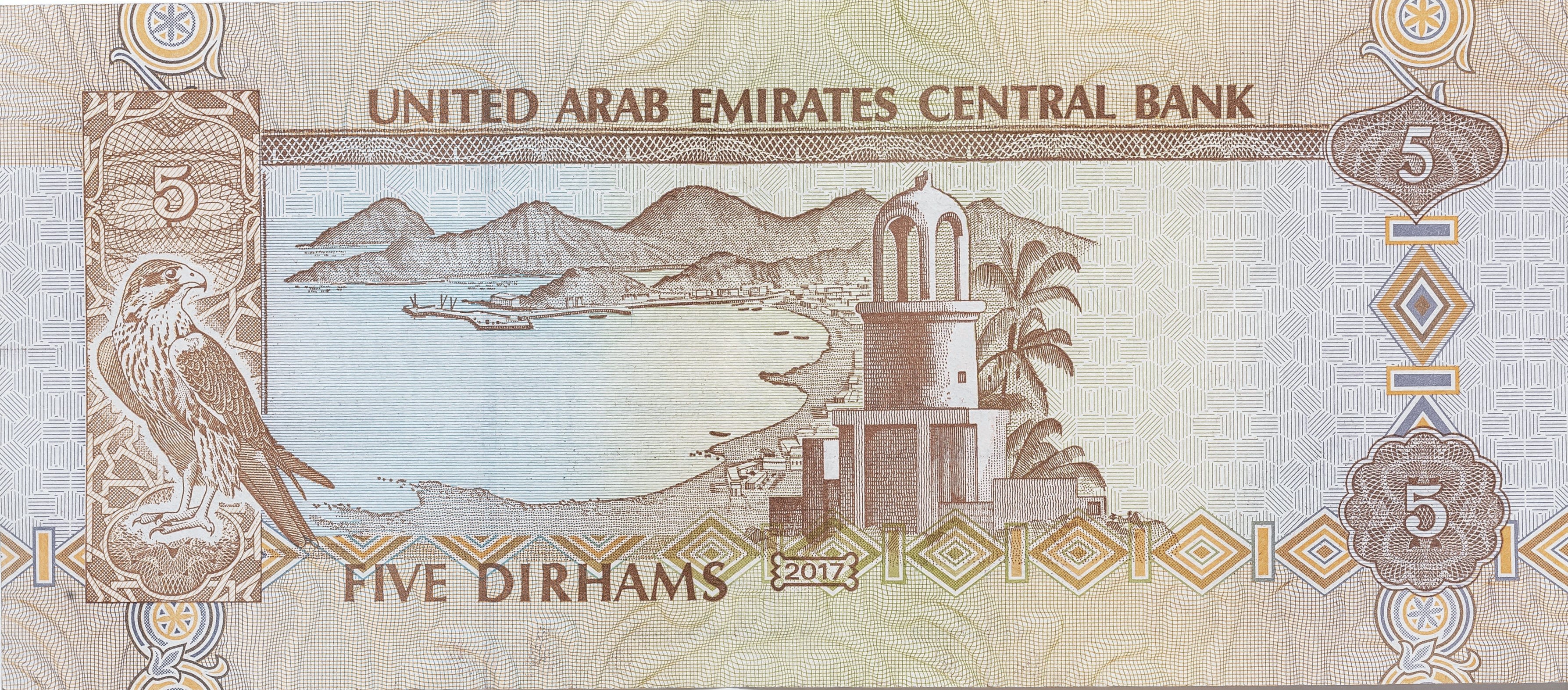 The Arabic face showed a farm with trees and date palms. The other side featured a khanjar, the carved dagger worn by Emirati men at ceremonies, while the watermark included the crest of the UAE, with the spread wings of the Hawk of Quraish, the tribe of the Prophet Mohammed.