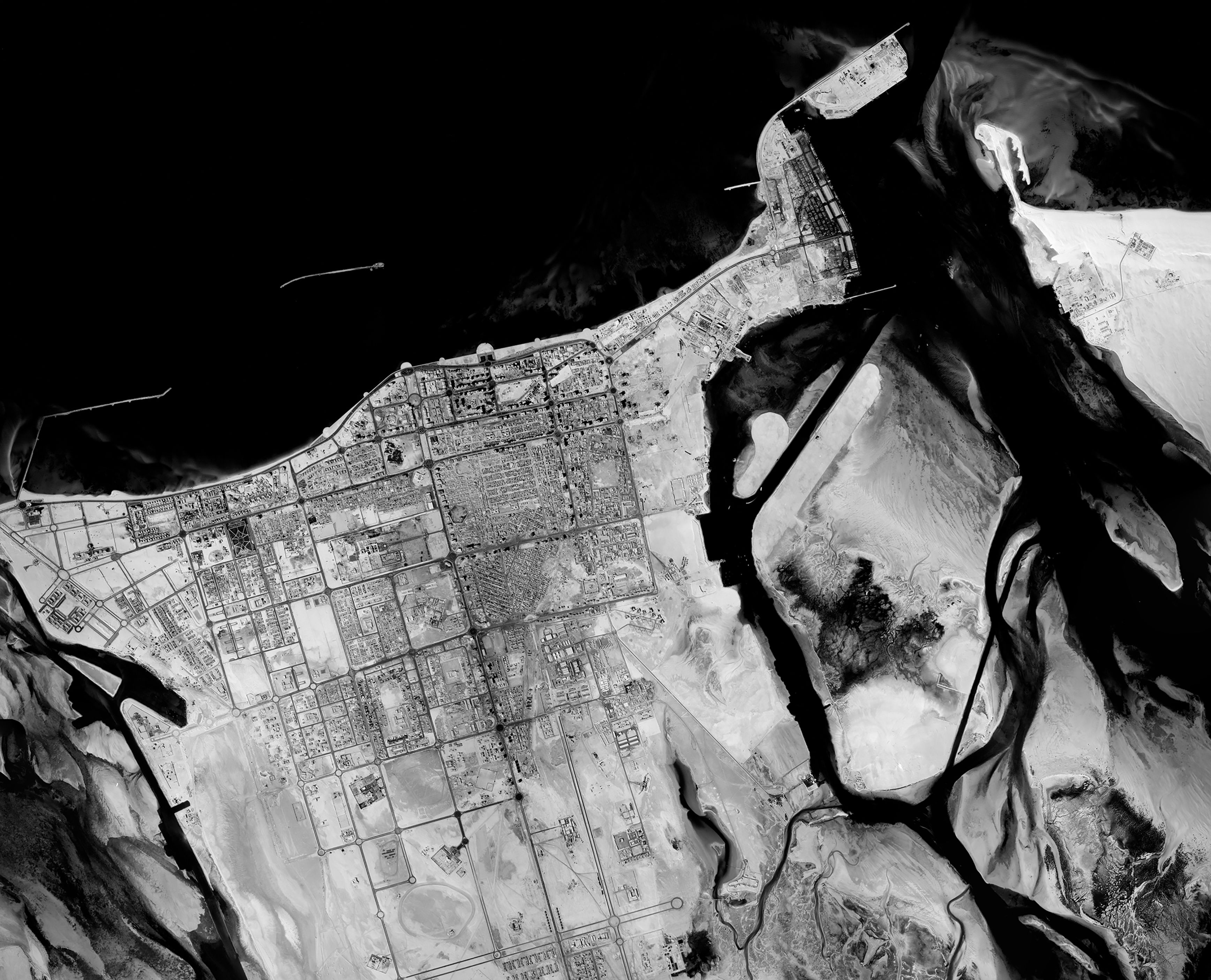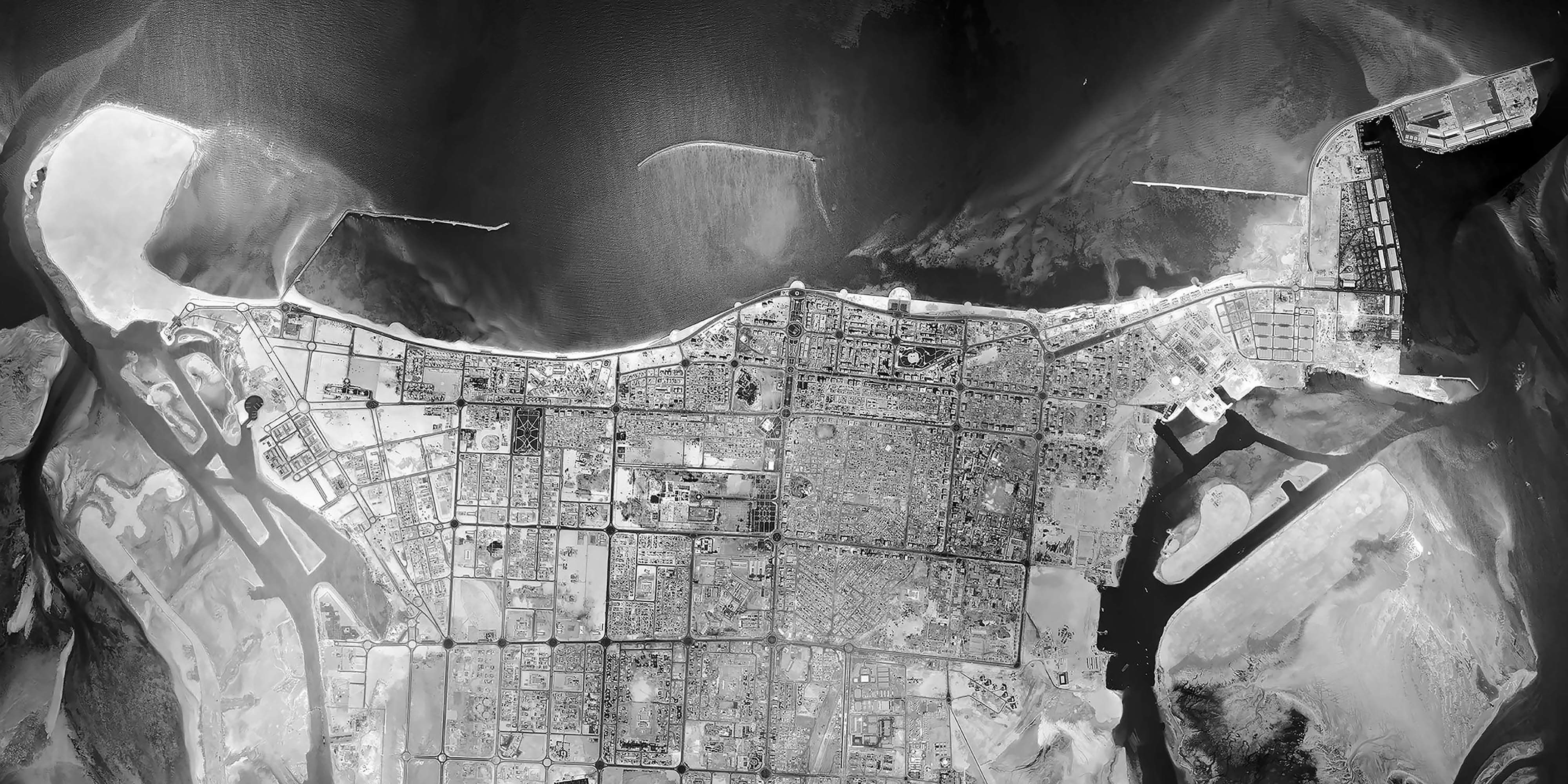 The beginnings of Al Maryah Island, now Abu Dhabi’s financial district, is visible beside Reem Island. The greening of the city is notable, as new parks emerge.