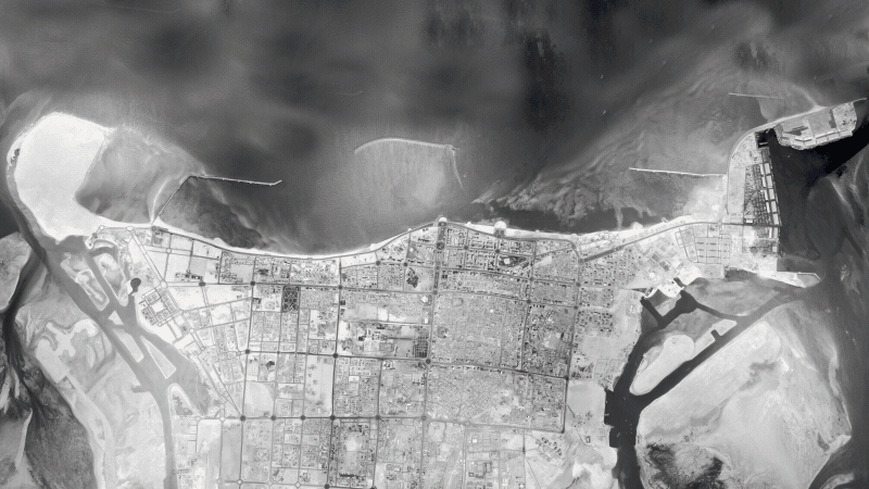 An aerial panorama of Abu Dhabi island, from May 20, 1970. Photo: NCAP