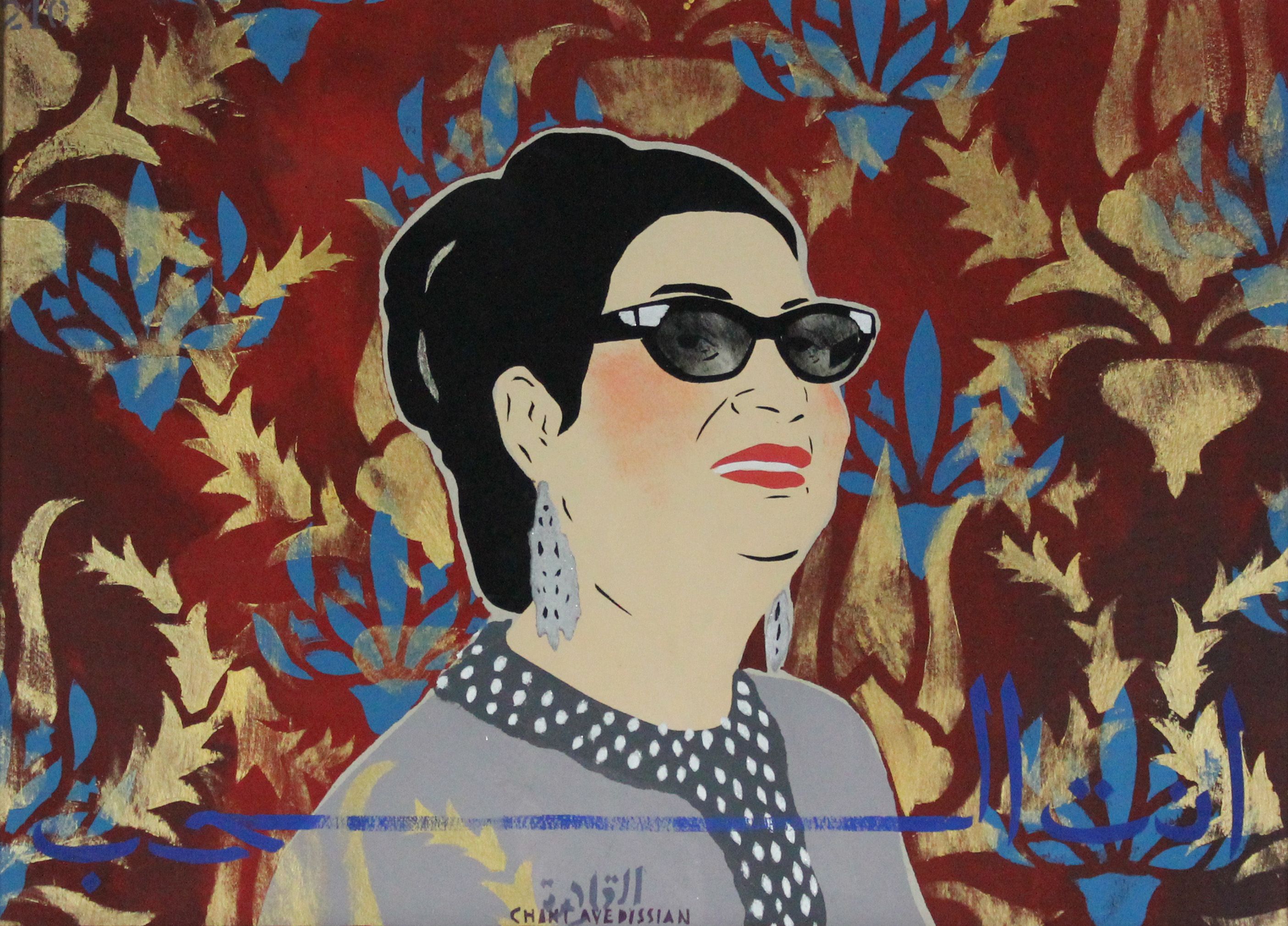 Combining pop culture and folkloric traditions and style, Avedissian’s paintings in this series, and in particular his portrait of Umm Kulthum, were incredibly popular and recognisable. Avedissian painted Umm Kulthum as she was seen and recognised by the public and her fans - ornately dressed and styled, wearing sunglasses.
