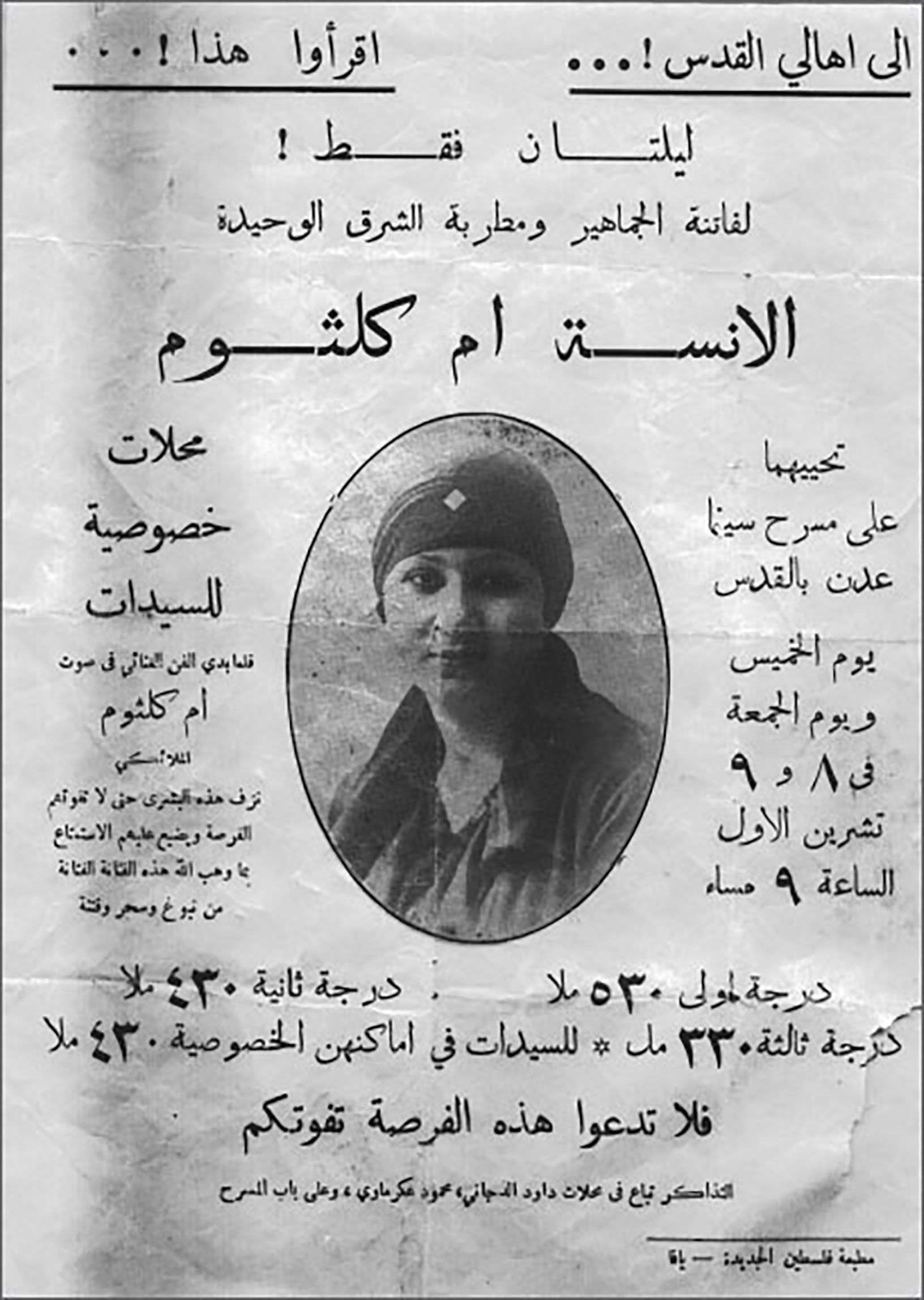 A poster advertising an Umm Kulthum radio concert held in Yafa in Palestine in the 1930s