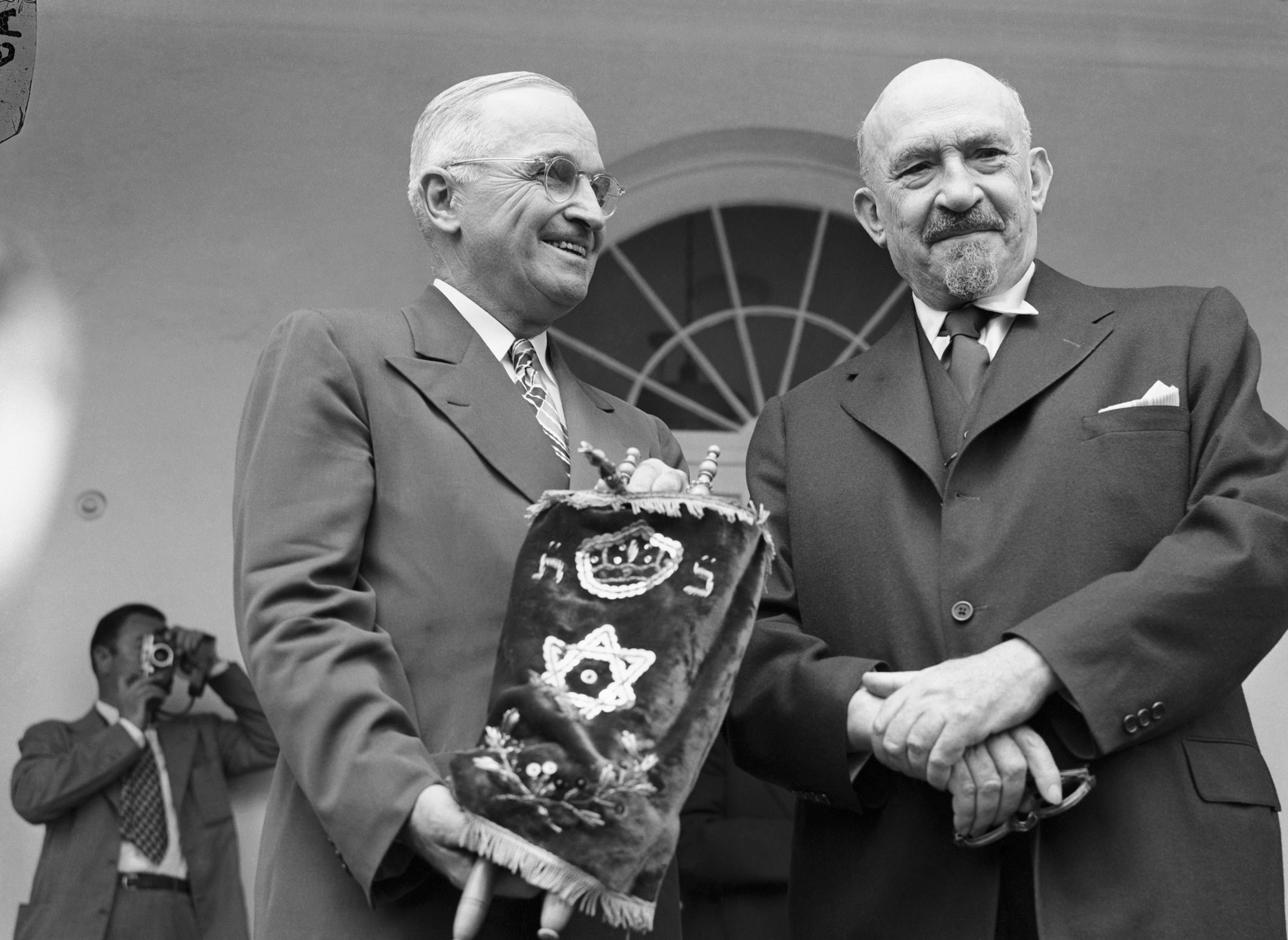 US president Harry S Truman, left, receives a Torah from Chaim Weizmann, the first president of Israel, during a visit to Washington on May 25, 1948. Getty Images